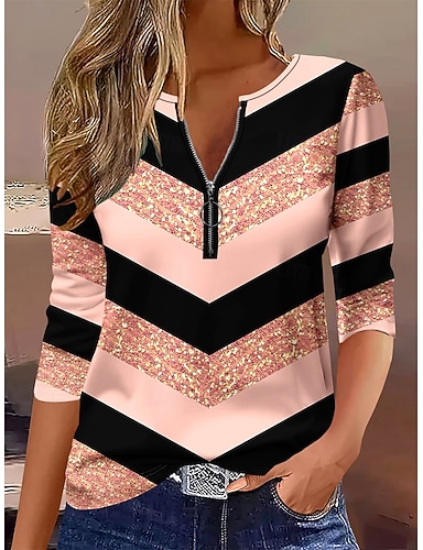 Жен. Футболка Графика Геометрический принт Полоски Элегантный стиль Винтаж Стиль Длинный рукав Круглый вырез Зубчатая шея Обычные топы Повседневные выходные Молния С принтом Розовый Весна Осень Зима