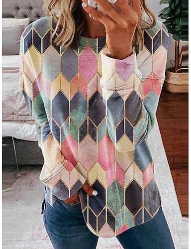 Жен. Футболка Графика Геометрический принт Винтаж Стиль На каждый день Длинный рукав Вырез под горло Обычные топы Повседневные выходные С принтом Желтый Красный Лиловый Зеленый Весна Осень Зима