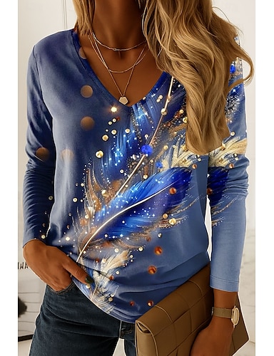 Женская Футболка Длинный Рукав V-образный Вырез Длинный Рукав Туника Графика Перо Винтаж Стильная Повседневная Регулярные Топы Повседневная Печать Синяя Фиолетовая Зеленая Весна Осень Предосень