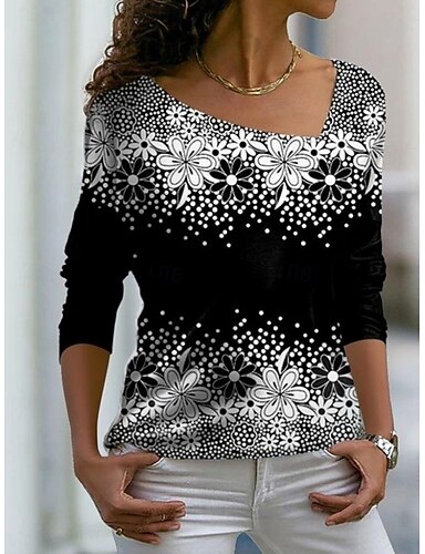 Женская футболка с длинными рукавами цветочный графический растения винтажный стиль базовая длинный рукав v-образный вырез плечо обычные топы выходные принт ассиметричный черный весна осень зима