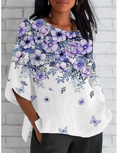 Жен. Футболка Омбре Цветочный принт Графика Винтаж Классика На каждый день Рукав 3/4 V-образный вырез Обычные топы Повседневные выходные Одежда для пляжа С принтом Фиалковый Лето Весна Осень