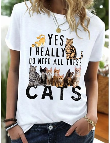 Жен. Футболка Графика Животное Кот Винтаж Стиль Классика С короткими рукавами Вырез под горло Круглый вырез Обычные топы Повседневные выходные С принтом Черный Белый Красный Синий Лиловый Лето Весна