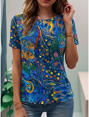 Жен. Футболка Цветочный принт Графика Горошек Винтаж Стиль Классика С короткими рукавами Вырез под горло Круглый вырез Обычные топы Повседневные С принтом Темно синий Лето