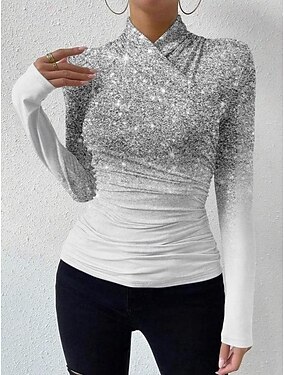 Жен. Футболка Омбре На каждый день Длинный рукав V-образный вырез Вырез под горло Обычные топы Отпуск Повседневные С принтом Асимметричный вырез Серебряный Черный Розовый Весна & осень
