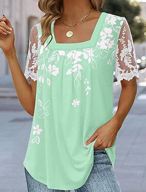 Жен. Футболка Сетчатый топ в стиле пэчворк Кружевная футболка Цветочный принт Классический С короткими рукавами Квадратный вырез Обычные топы Праздники выходные Кружева С принтом