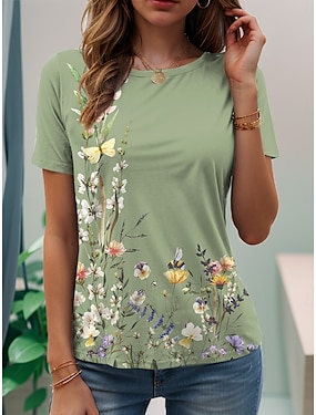 Жен. Футболка Цветочный принт Графика Растения Винтаж Стиль Классика С короткими рукавами Вырез под горло Круглый вырез Обычные топы Повседневные С принтом Лиловый Зеленый Серовато-белый Серый Лето
