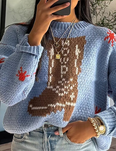 Жен. Вязаная ткань Пуловер Мода Уличный стиль На каждый день Графика Вырез под горло Трикотаж С принтом Длинный рукав Обычные топы Вязать Рождество Повседневные Праздники Красный Осень Зима