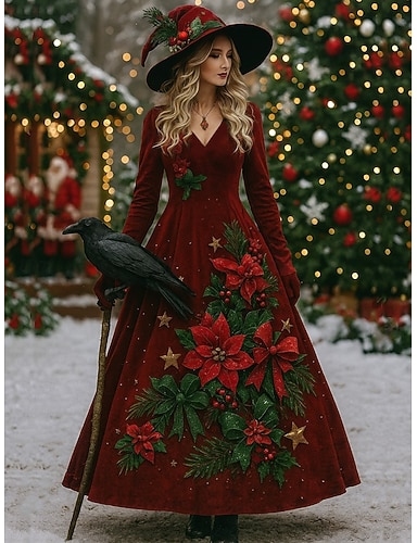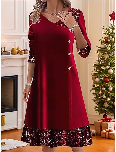 Новогодняя тематика Жен. Платье средней длины Платье A-силуэта Отпуск На каждый день Для вечеринок Праздники Стандартный Графика Дед Мороз Новогодняя ёлка Длинный рукав V-образный вырез