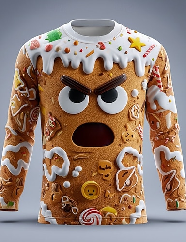 Новогодняя тематика Муж. 3D Пряничные человечки Футболка Длинный рукав Футболка 3D печать Вырез под горло Рубашка Мода Классический 3D Для улицы Повседневные Коричневый Коричневый 2 Коричневый 4