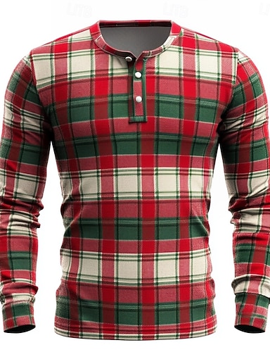 Муж. Новогодняя тематика В клетку Рубашка Хенли Длинный рукав Мода Симпатичные Стиль Повседневные Повседневные Праздники На выход Зима Весна & осень Красный Хенли Футболка Хенли