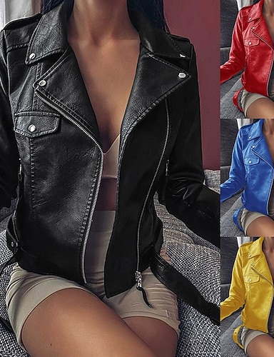 Жен. Кожаные куртки Сохраняет тепло Удобный Молния Пуговицы На каждый день Сплошной цвет Отпуск Для улицы Повседневные На каждый день Обычная Отложной Стандартный Длинный рукав Верхняя одежда