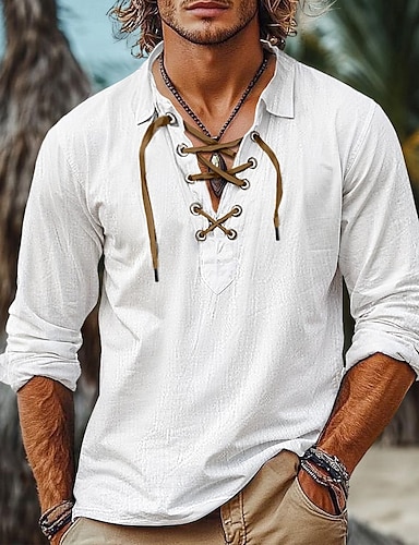 Муж. Рубашка Льняная рубашка Стиль Викингов Летняя рубашка Пляжная рубашка Западная рубашка Сплошной цвет Отпуск Повседневные Черный Белый Зеленый Длинный рукав V-образный вырез Одежда Кулиска