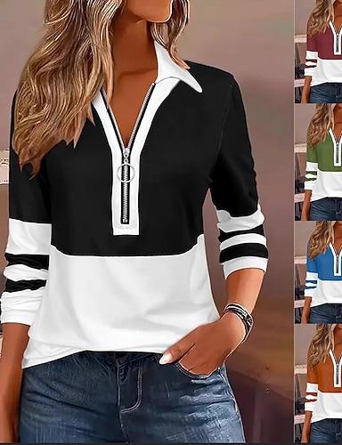 Жен. Туника Сплошной цвет Контрастных цветов Элегантный стиль Винтаж Стиль Длинный рукав Вырез под горло Обычные топы Повседневные Четверть молния Черный Винный Синий Коричневый Зеленый Весна Осень