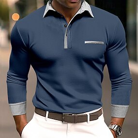 Муж. Рубашки-поло из вафельной ткани Рубашки поло Официальные Офис Ребристый воротник-поло Длинный рукав Мода Удобный Контрастных цветов Пуговицы Лето Весна Осень Черный Темно синий