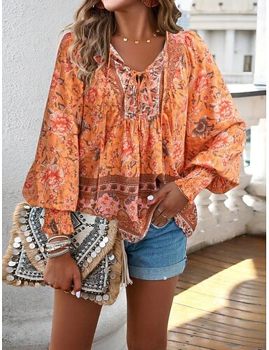 женская блузка стильная бохо цветочный галстук спереди рукав-фонарик длинный рукав завязка на шее повседневная розовый темно-синий оранжевый зеленый летний
