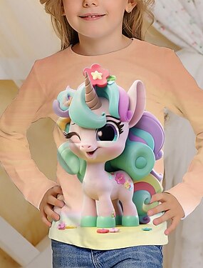 Девочки 3D Графика единорогом Футболка Длинный рукав Весна Осень Мода Классический Дети 4-12 лет Вырез под горло на открытом воздухе Повседневные Стандартный
