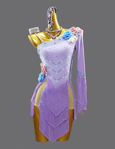 Латино Платье Лепестки Кристалл / горный хрусталь С кисточками Жен. Выступление Для вечеринок Длинный рукав Спандекс