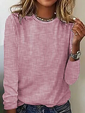 Женская футболка с длинным рукавом круглый вырез длинная туника полосатая базовая круглошейная обычные вещи повседневный выходной принт розовый синий зеленый серый осень и зима предосень