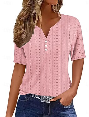 Футболка Жен. Черный Белый Розовый Полотняное плетение Кружева кнопка Для улицы Повседневные Мода V-образный вырез Стандартный S