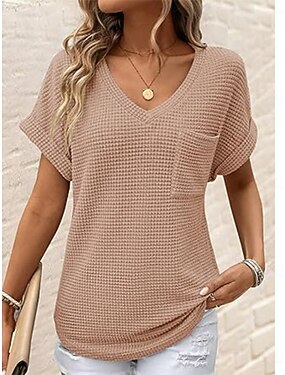 Жен. Блуза Сплошной цвет Стиль На каждый день С короткими рукавами V-образный вырез Обычные топы Повседневные Карман Черный Белый Розовый Зеленый Лето