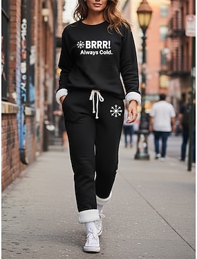 Женский комплект пижам с флисовой подкладкой 2 предмета свитшот спортивные костюмы теплый комфорт мягкий пуловер с длинным рукавом длинные брюки круглый вырез текст эластичный пояс домашний