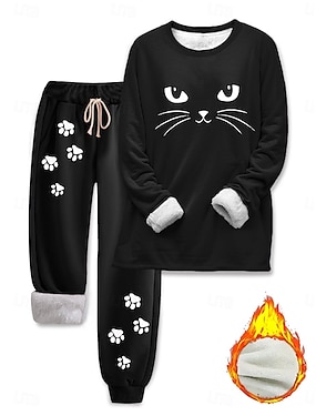 Женский комплект пижам с флисовой подкладкой элегантный теплый модный комплект из двух частей спортивные костюмы брюки наборы с длинным рукавом круглым вырезом графический рисунок животного текст