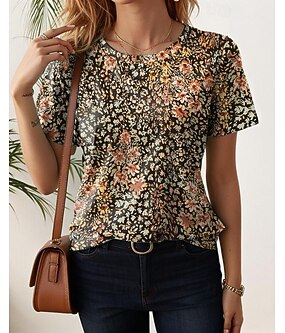 Жен. Футболка Цветочный принт Стиль На каждый день С короткими рукавами Вырез под горло Обычные топы Повседневные С принтом Хаки Лето