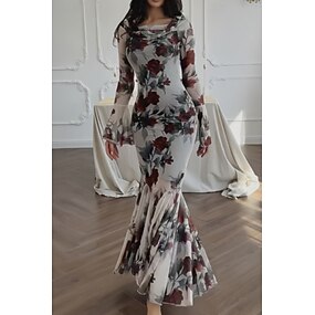 Жен. длинное платье платье макси Платье-футляр Цветочное платье Платье с принтом Мода Элегантное платье на открытом воздухе Праздники Свидание Стандартный Цветы Длинный рукав Вырез под горло Розовый