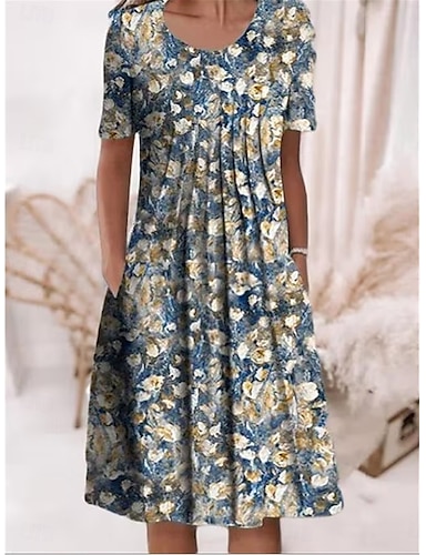 Жен. Платье средней длины Повседневное платье Летнее платье Мода Современное Повседневные Пляж выходные Стандартный Цветочный принт С короткими рукавами Вырез под горло