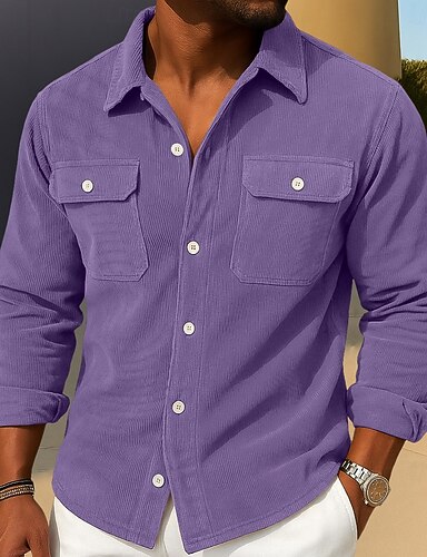 Муж. Вельветовая рубашка Розовый Темно синий Лиловый Зеленый Серый Длинный рукав Отложной Школа Учебный Карман Одежда Винтаж На каждый день