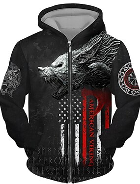 Муж. Викинг-воин Графические принты Викинг Толстовка Худи Повседневные Классика Длинный рукав Капюшон Праздники На выход Уличная одежда Черный Красный С принтом Весна & осень Дизайнер