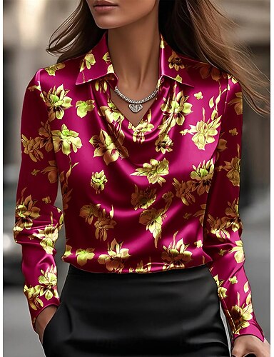 Жен. Рубашка Цветочный принт Элегантный стиль Повседневные Вырез-хомут Офис Повседневные Для вечеринок Драпировка Красный Синий Изумрудно-зеленый Лиловый Весна Осень Зима