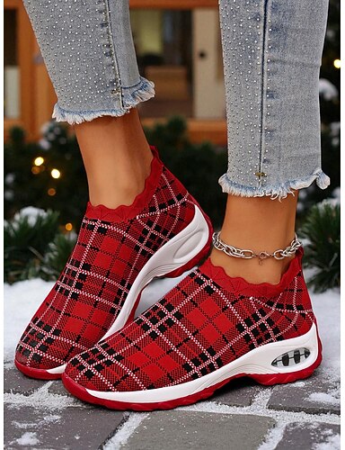 Женские красные клетчатые кеды с воздушной подошвой, удобные и легкие, повседневные туфли для Рождества, прогулок и путешествий.
