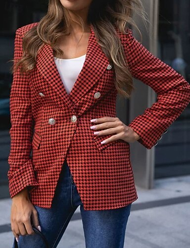 Жен. Блейзер Удобный Карман Элегантный стиль Мода На открытом воздухе Решетка На выход На каждый день выходные Двубортный крой Обычная Лацкан Стандартный Длинный рукав Верхняя одежда