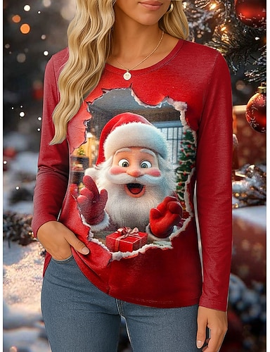 Новогодняя тематика Жен. Футболка Графика Дед Мороз Винтаж Мода Стиль Длинный рукав Вырез под горло Обычные топы Повседневные выходные С принтом Красный Весна Осень Зима