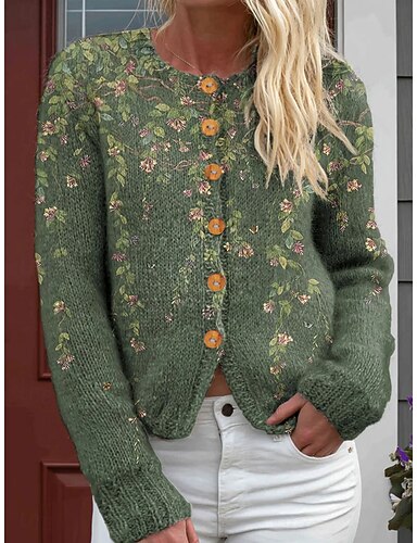 Жен. Кардиган Мода Повседневные На каждый день Цветочный принт Графика Рельефный узор Вырез под горло Пуговицы С принтом Длинный рукав Обычные топы Вязать на открытом воздухе Повседневные Свидание