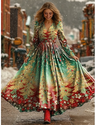 Женское рождественское платье макси, плиссированное платье для вечеринок, повседневное, бохо, для свиданий, для прогулок, классический крой, с длинным рукавом, с V-образным вырезом, бордовое, зеленое,