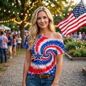 250-летие США Ретро В стиле 1980-х Как у футболки На одно плечо Короткие рукава На одно плечо Галстук с принтом Маскарадный костюм Жен. 250-летие США 4 июля День независимости Взрослые Футболка Лето