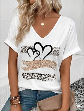 Жен. Футболка Омбре С сердцем Леопард На каждый день С короткими рукавами V-образный вырез Обычные топы Повседневные На выход Одежда для пляжа С принтом Белый Лето