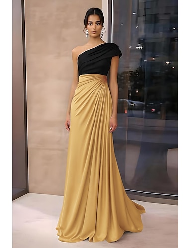 Футляр В пол Выпускные платья Вечернее платье С пышной юбкой Торжественное платье Элегантный стиль Без рукавов На одно плечо Торжественное мероприятие Гость на осенней свадьбе Сатин С открытой спиной