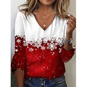 Новогодняя тематика Жен. Футболка Графика В снежинку Винтаж Стиль Классический Рукав 3/4 V-образный вырез Обычные топы Повседневные выходные С принтом Красный Зима