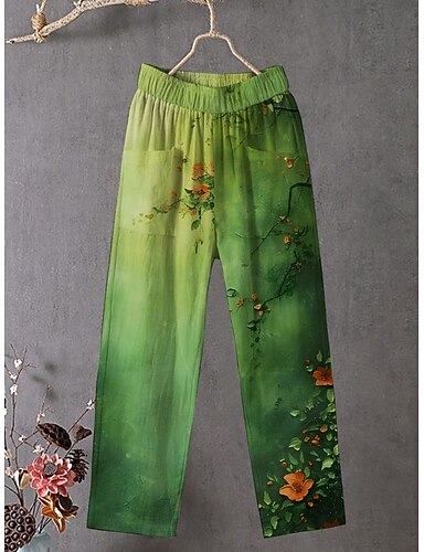 Жен. Чино Брюки Уличный стиль На каждый день Полная длина Завышенная Цветочный принт Эластичная талия С принтом Воздухопроницаемость Удобный Эластичная Отпуск Для улицы На каждый день Зеленый