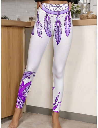 Жен. Брюки Леггинсы Уютные леггинсы На каждый день Богемный Полная длина Завышенная Перо Эластичная талия С принтом Воздухопроницаемость Удобный Эластичная Отпуск Для улицы На каждый день