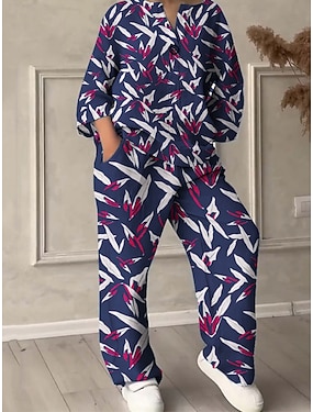 Жен. Элегантный стиль Богемия Отпуск Рубашка Комплекты брюк Длинный рукав Рубашечный воротник Графика Пэчворк на открытом воздухе Отпуск Для вечеринок Цвет бордо Темно-синий Синий Лето