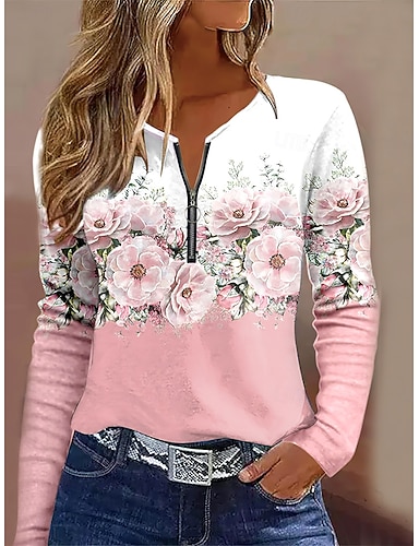 Жен. Футболка Омбре Цветочный принт Графика Элегантный стиль Винтаж Стиль Длинный рукав Круглый вырез Зубчатая шея Обычные топы Повседневные выходные Молния С принтом Розовый Небесно-голубой Лиловый