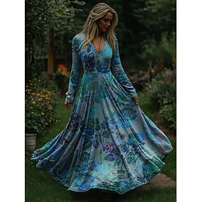Жен. Длинное платье Сарафан Платье A-силуэта Отпуск На каждый день Богемный День рождения Повседневные Праздники Свободное облегание Цветочный принт Длинный рукав V-образный вырез