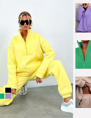 Жен. Комплекты спортивных костюмов Повседневные спортивные костюмы Комплекты мебели для гостиной из 2 предметов Широкие Однотонный Наборы одежды Весна Черный Военно-зеленный