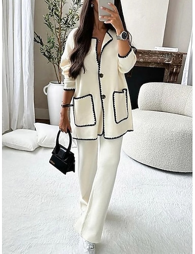 Жен. Мода Уличный стиль Повседневные Комплекты брюк Длинный рукав Вырез под горло Полотняное плетение Повседневные Черный Белый Розовый Весна Тонкие