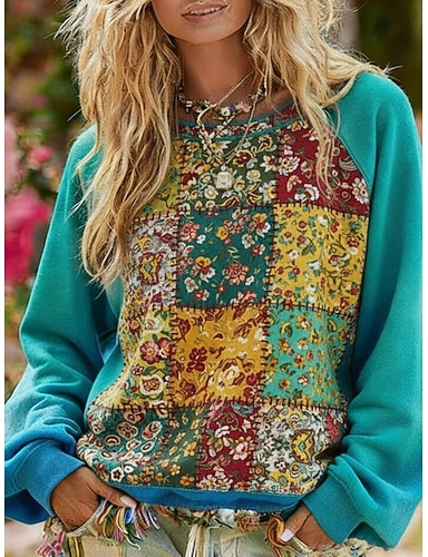 Жен. Pullover Толстовки Цветочный принт Контрастных цветов Винтаж Уличный стиль Классика Длинный рукав Вырез под горло Обычные топы На каждый день Повседневные С принтом Синий Весна Осень