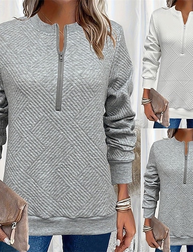 Жен. Пуловер Толстовка Полотняное плетение Уличный стиль На каждый день Длинный рукав Половина молния Обычные топы Для улицы На каждый день Молния Белый Серый Осень Зима